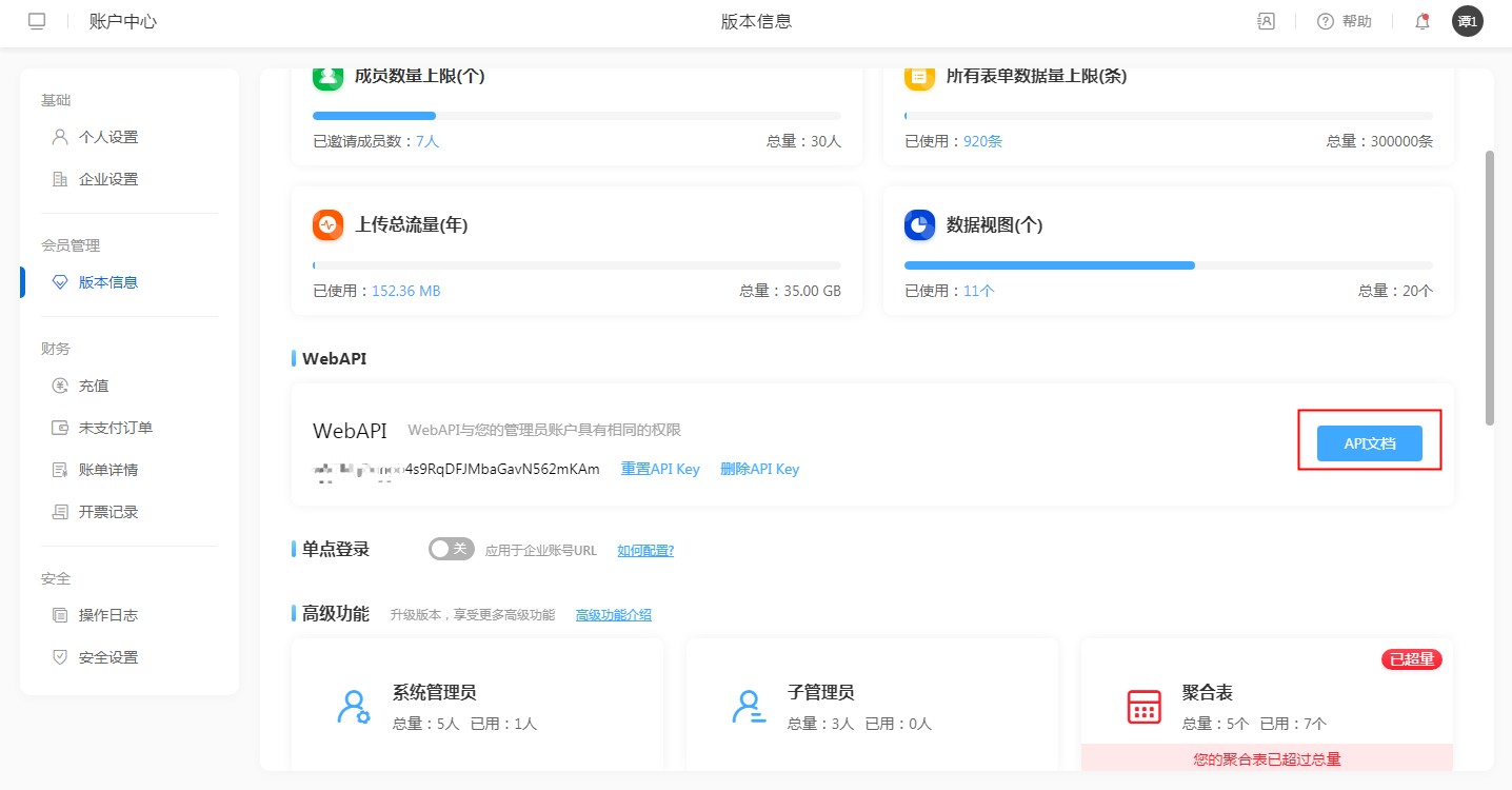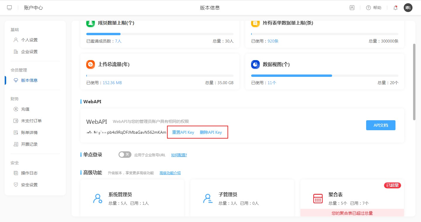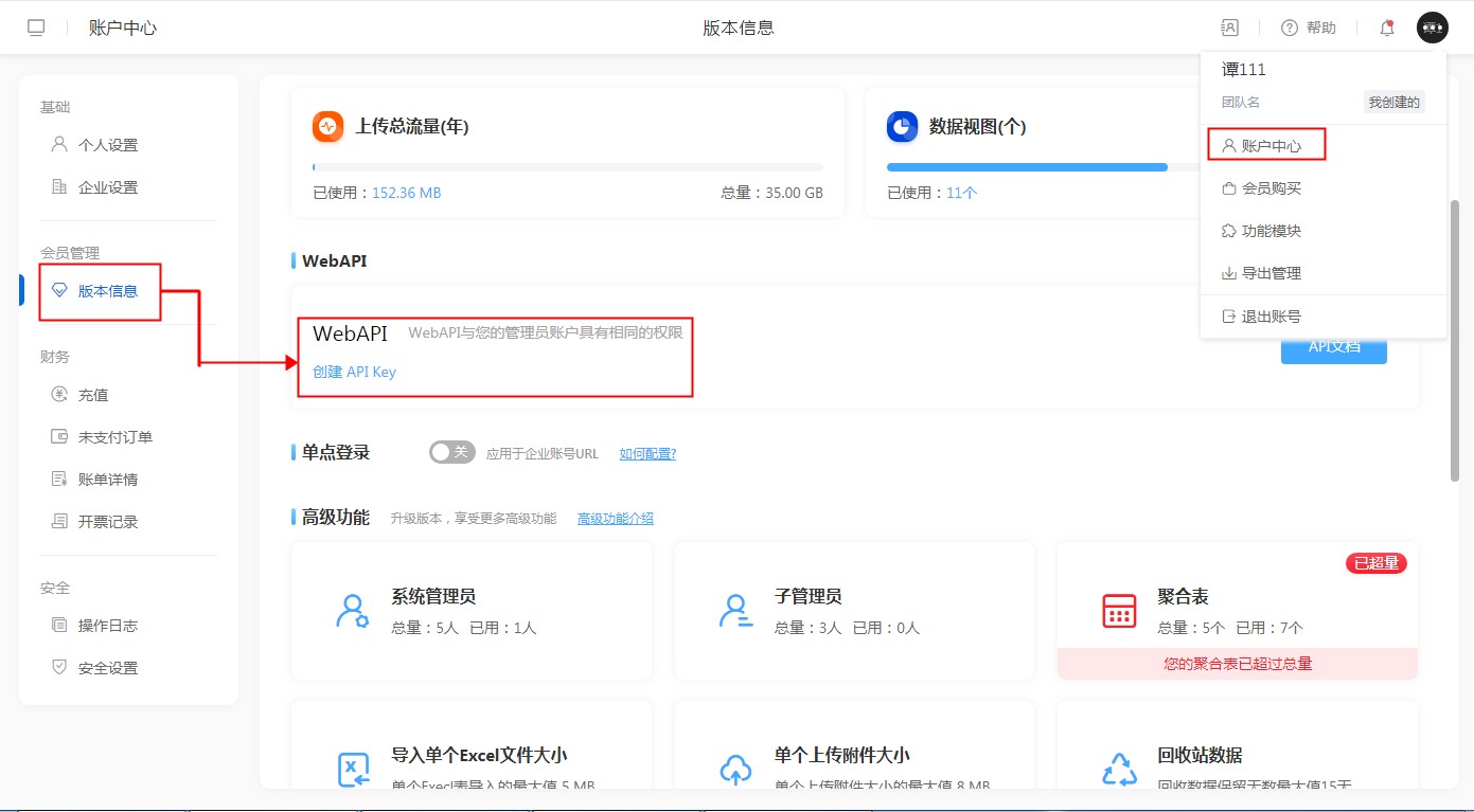API Key生成方式:【账户中心】——【版本信息】 ——【API Key】