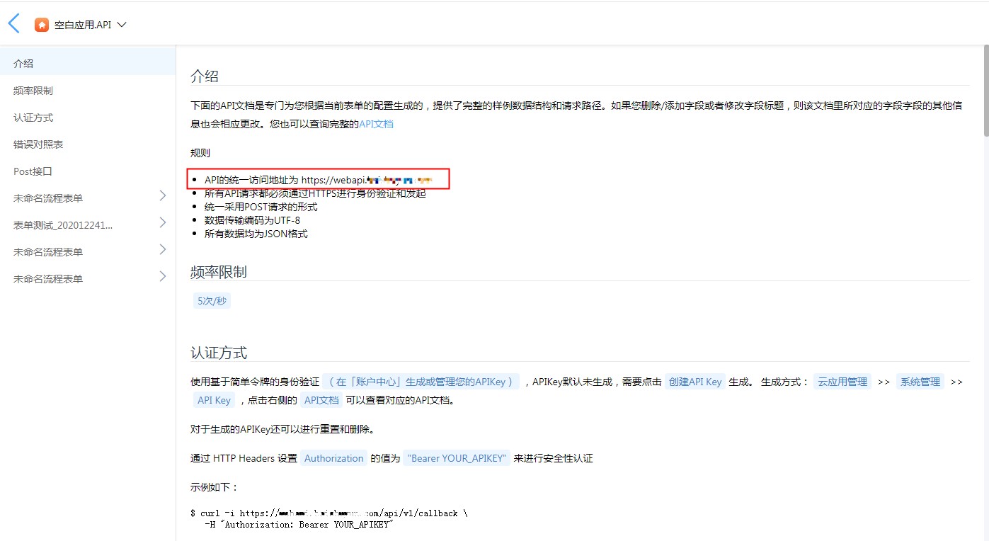 APIKey右侧的「API文档」是专门根据当前表单的配置生成的,可以点开查看详细的说明。