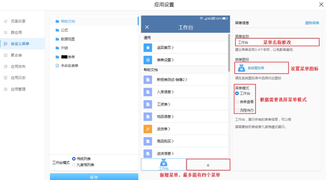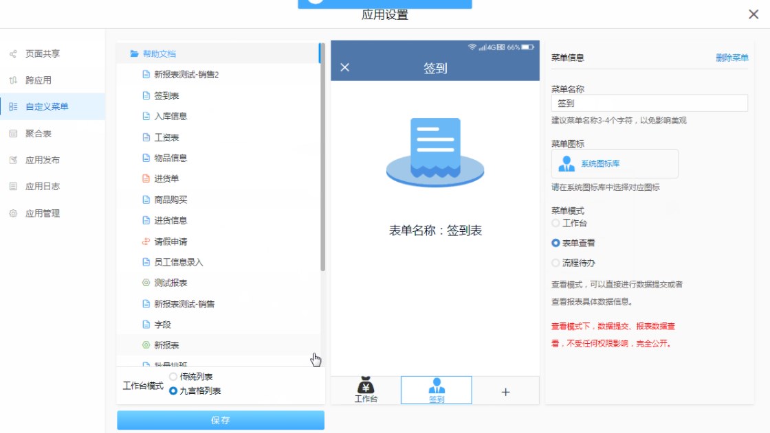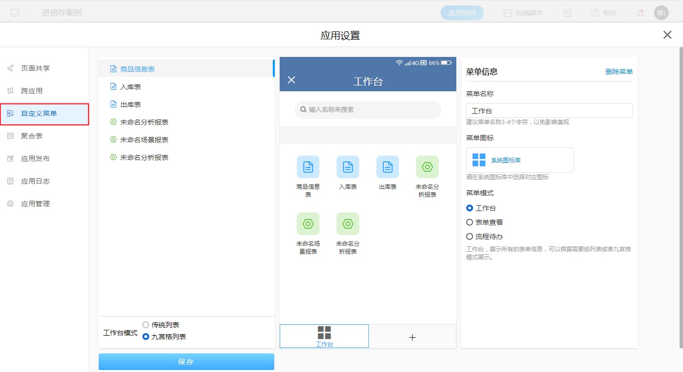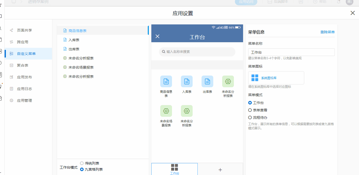 单个应用可以在应用编辑页面的应用设置里设置自定义菜单,菜单模式可按需设定。用户在移动端可以通过点击菜单项,直接访问某一表单、报表等。