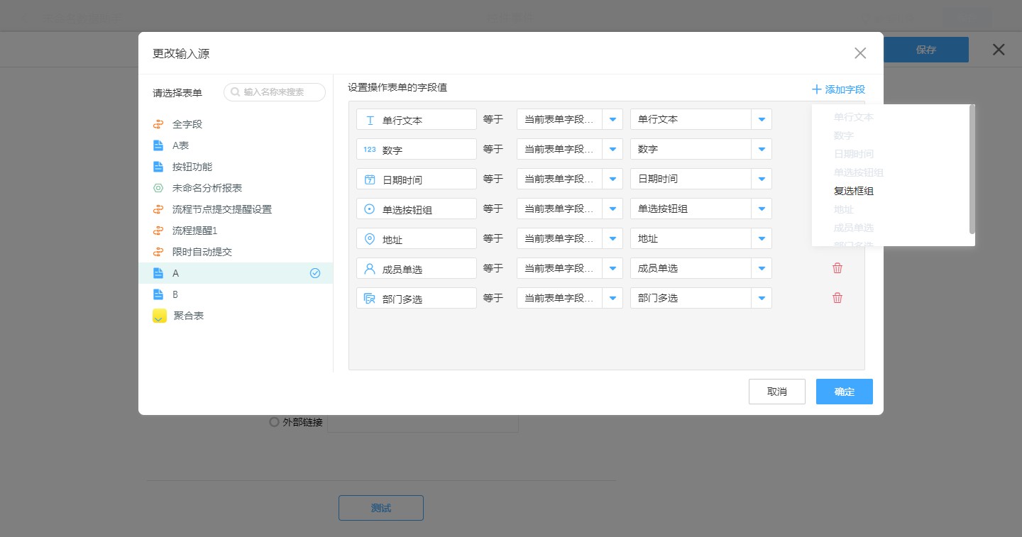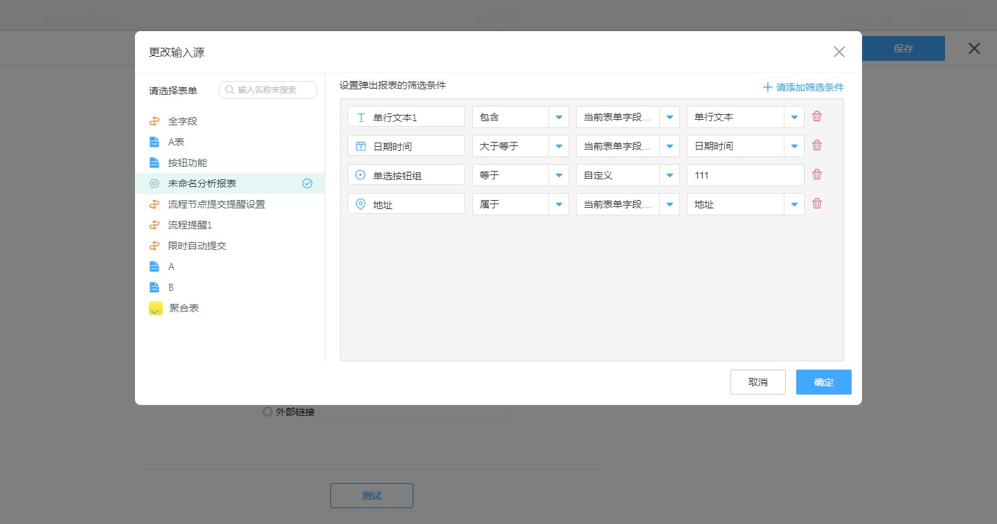 点击选择表单弹出弹窗,在弹窗中选择表单或报表。