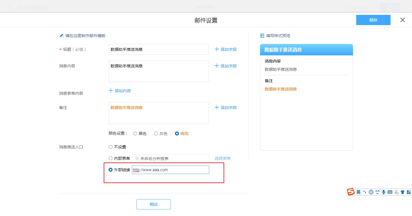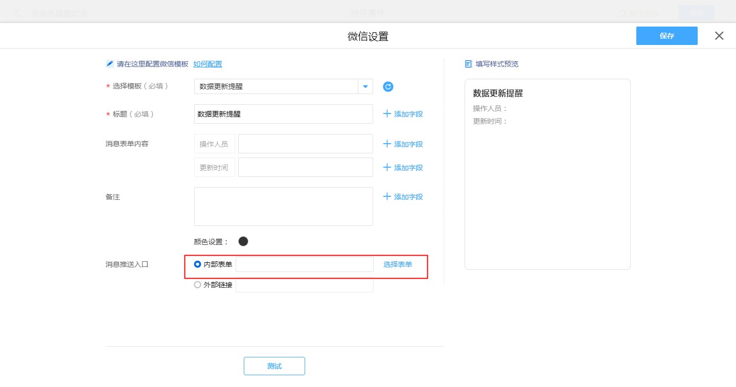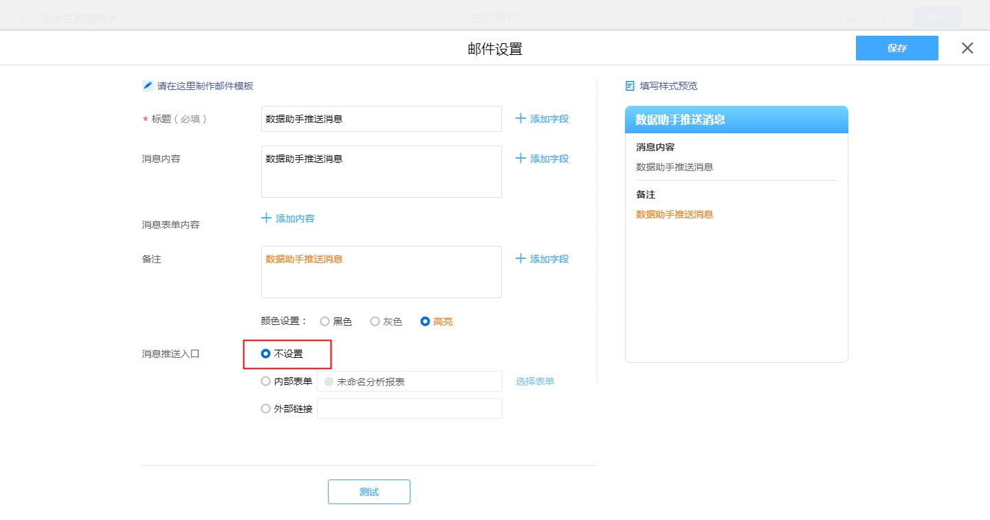 使用数据助手发送消息时,支持自定义消息的跳转链接,同时支持将当前消息表单的数据写入跳转的系统内部表单或报表中。