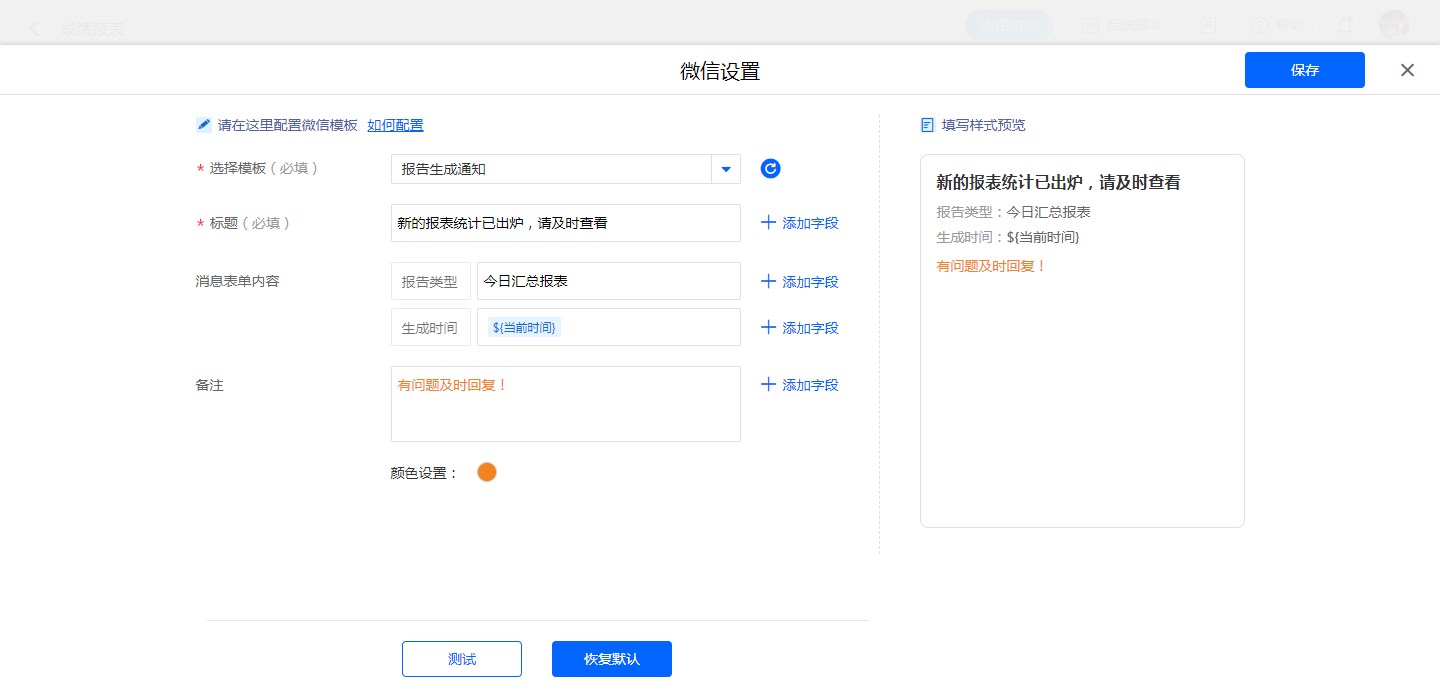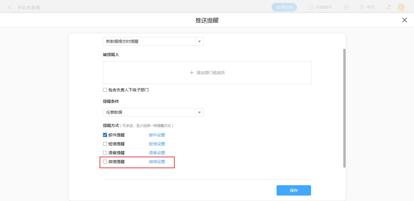 【应用管理】-【报表设计】-【定时提醒】 -【提醒方式】-【微信提醒,微信设置】