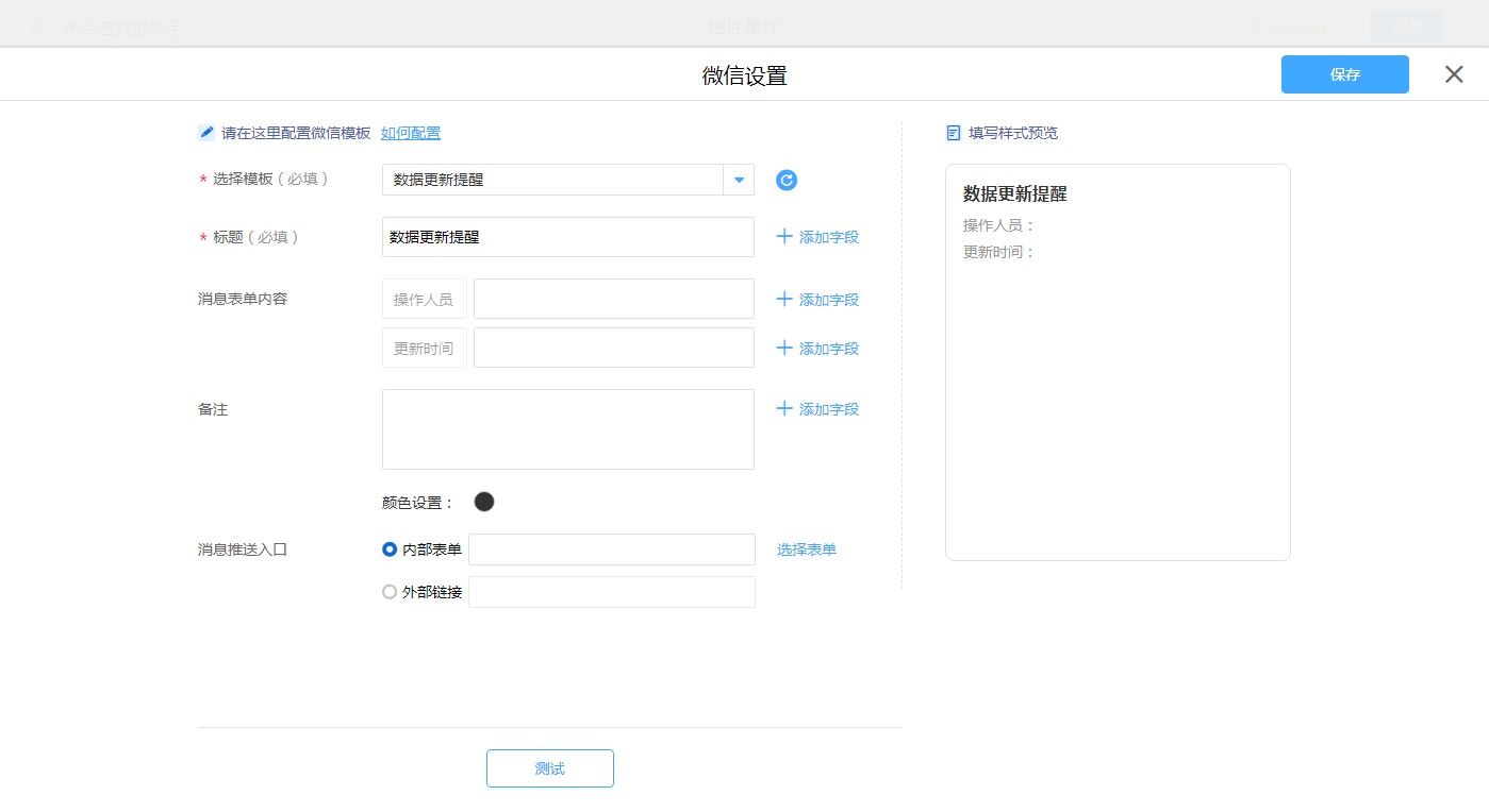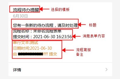 流程表单、普通表单、数据助手消息设置时选择微信提醒时,可设置微信消息模板。