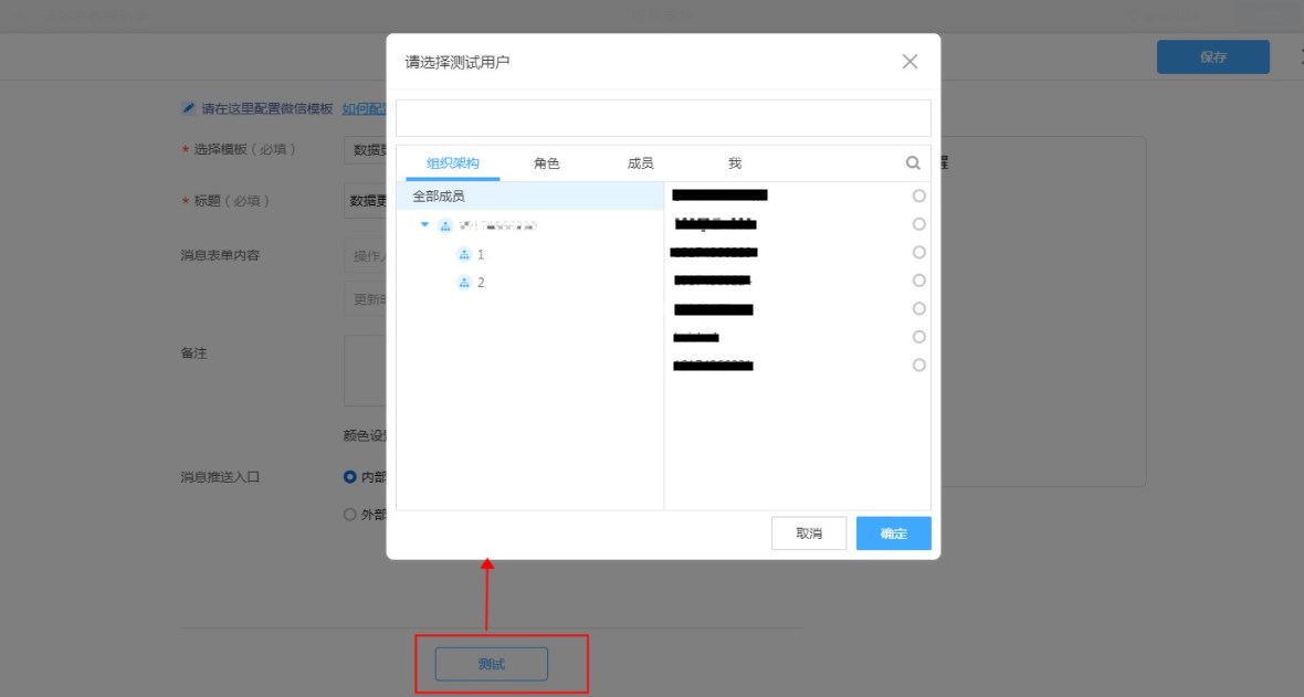 点击测试,选择收件人,确认即可将当前消息模板内容发送给此收件人。