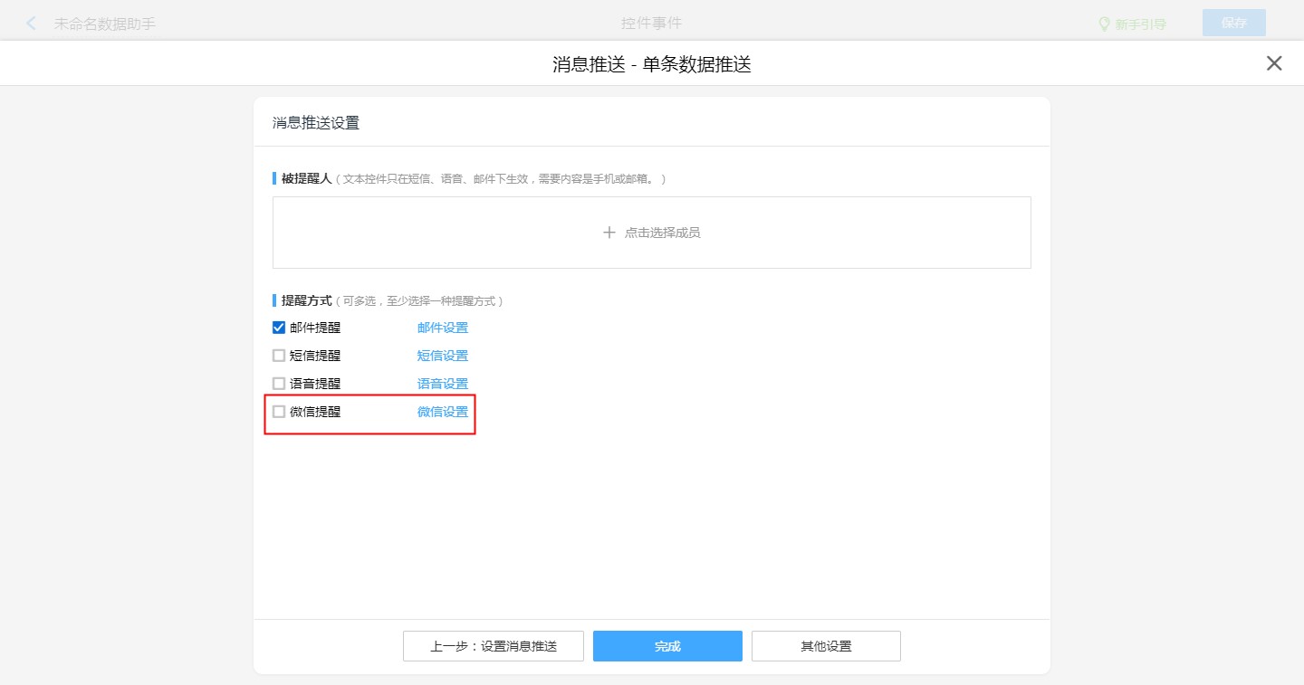 【普通表单设计】-【表单设置】-【消息推送】-【新建消息推送】-【微信提醒,微信设置】