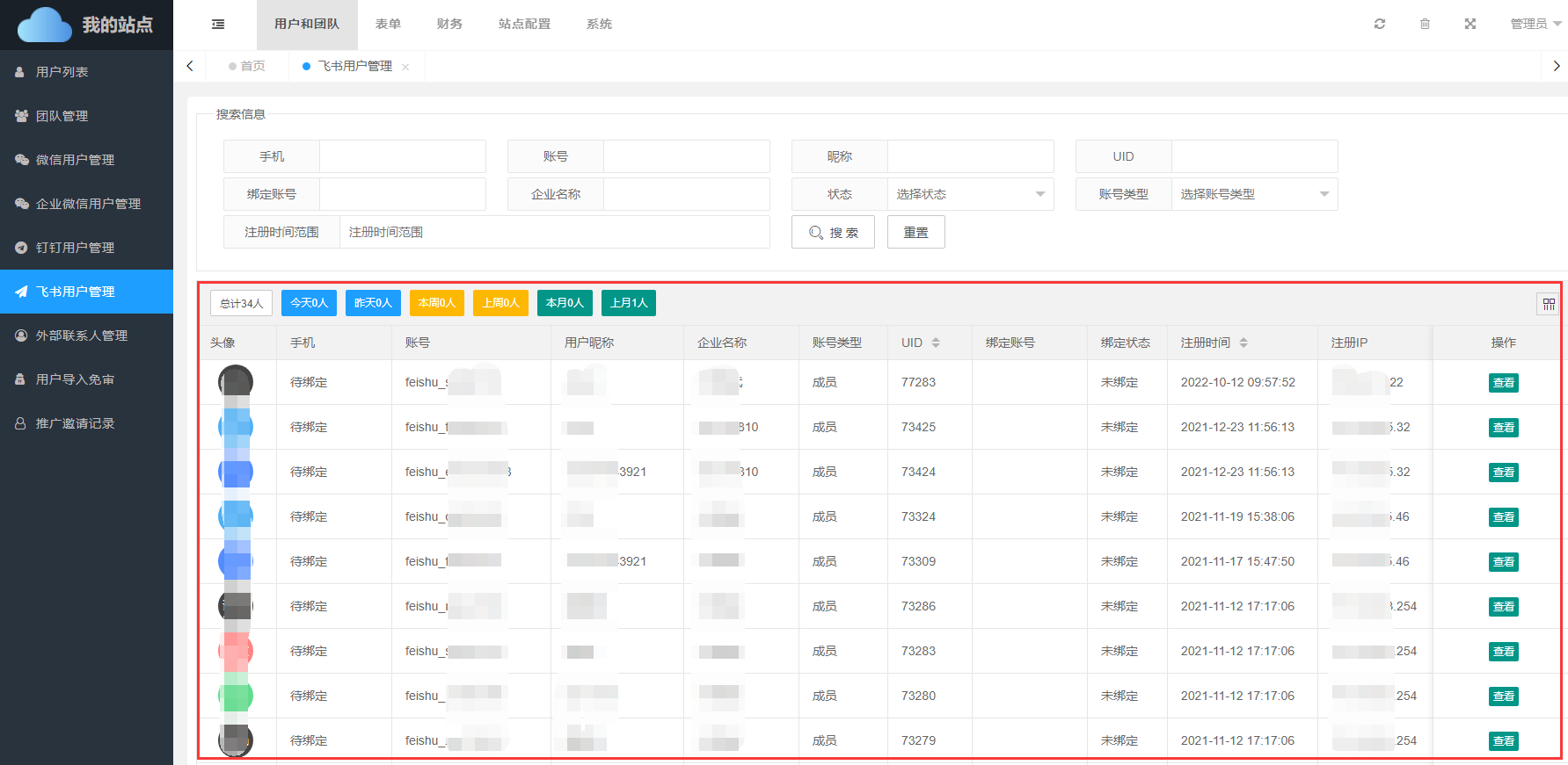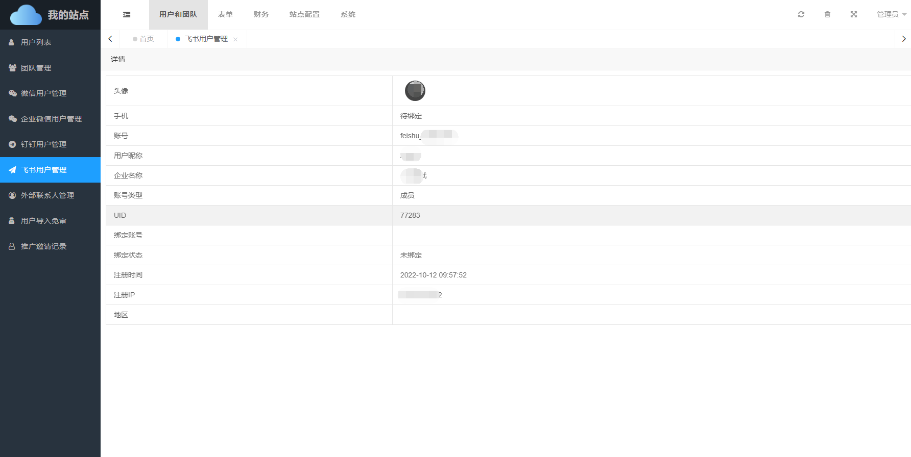• 绑定账号:飞书账号绑定的普通账号,只有系统管理员账号有绑定账号