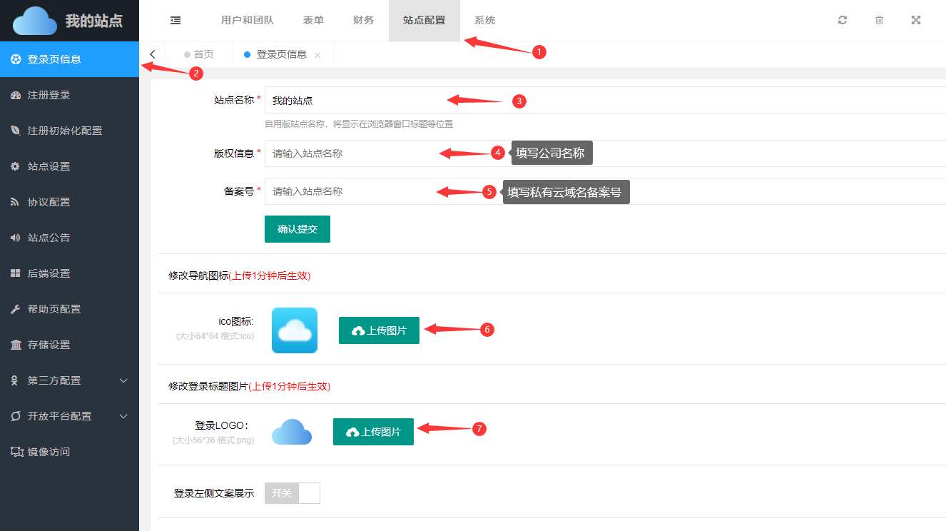 可以对包括站点名称、版权信息、备案号、ico图标、登录LOGO、登录左侧文案进行设置。