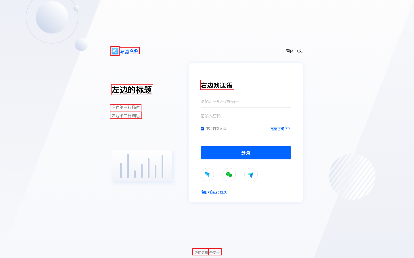 登录页信息主要设置和登录页面有关的内容,在此页面可进行站点名称、导航图标、登录页文案等和登录页有关的设置。