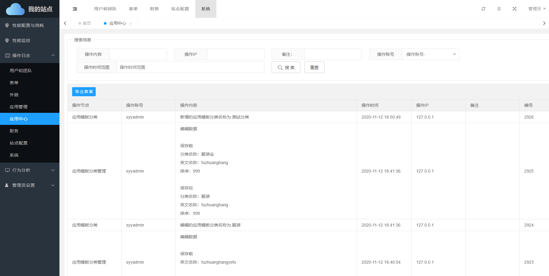 日志中会记录管理员对表单-应用中心分类下所进行的操作。