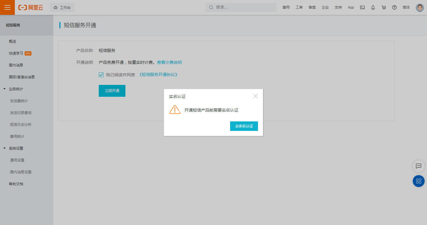 - 进行实名认证,这里请注意选择认证模式 企业模式才可以开通短信服务