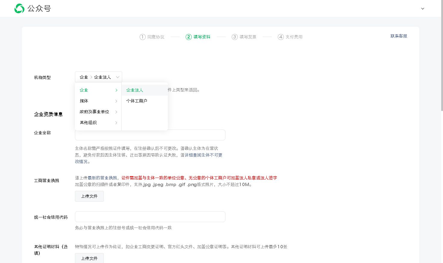 然后按照需求填写企业认证资料信息,(开放平台的认证流程填写的信息与微信公众号申请微信认证一样的流程。此步骤可参考微信认证申请方法)