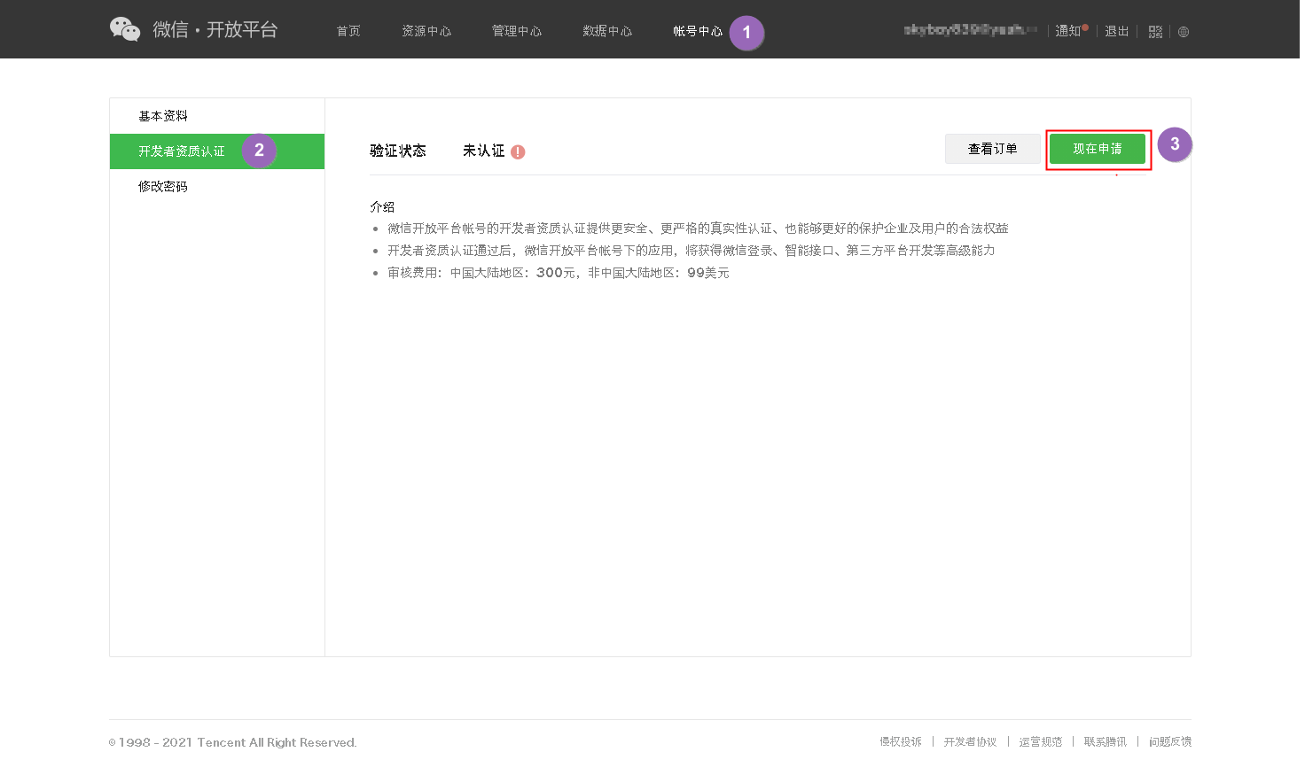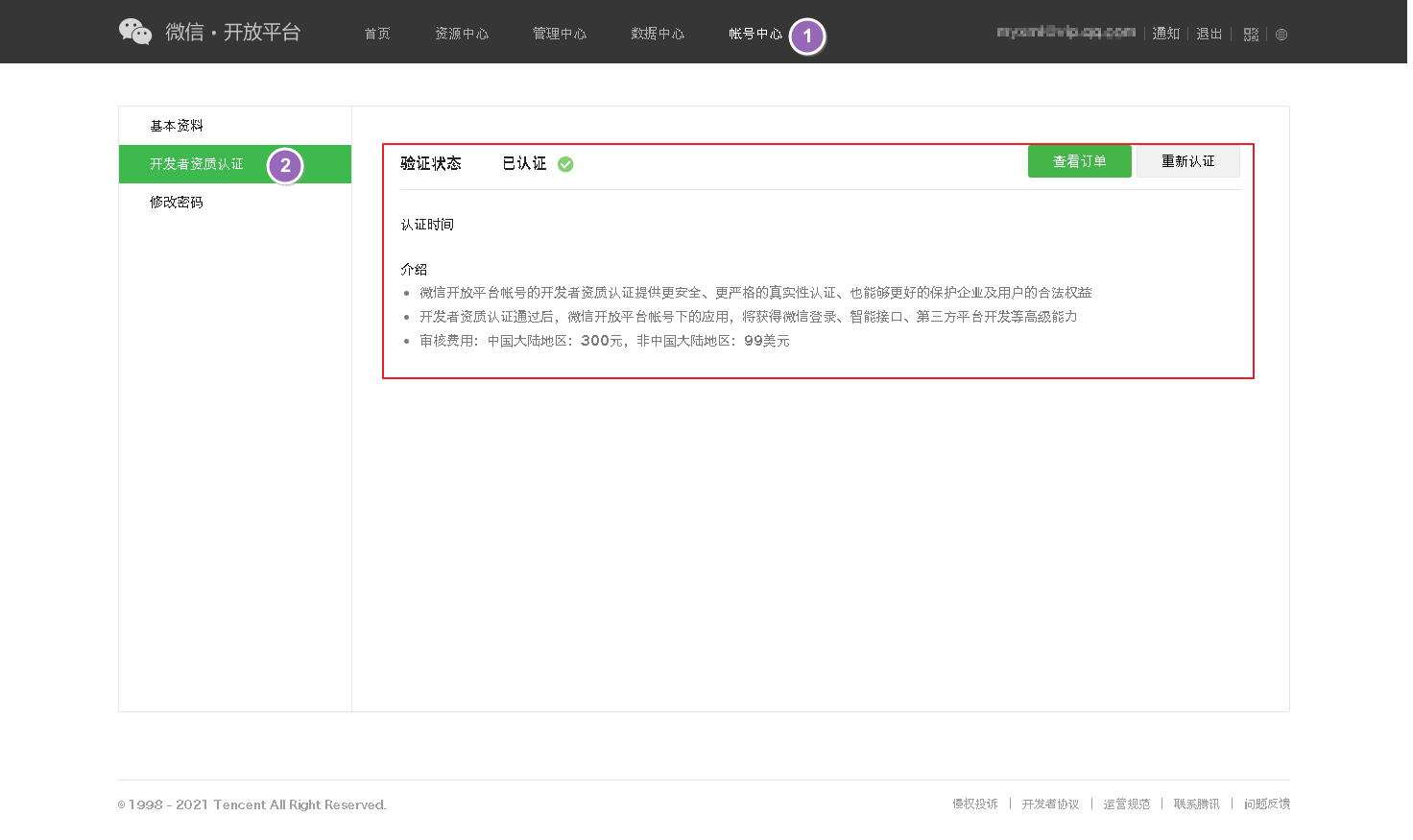 登录开放平台 -> 账号中心 -> 开发者资质认证