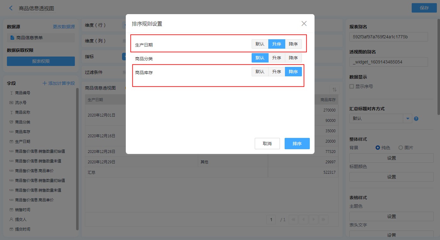 • 如果行维度有n个字段,则第n个字段和所有指标字段加起来只能有一个字段可以进行排序。给其中一个字段A设置了排序规则后又给另一个字段B添加了排序规则,则自动删除字段A的排序规则。