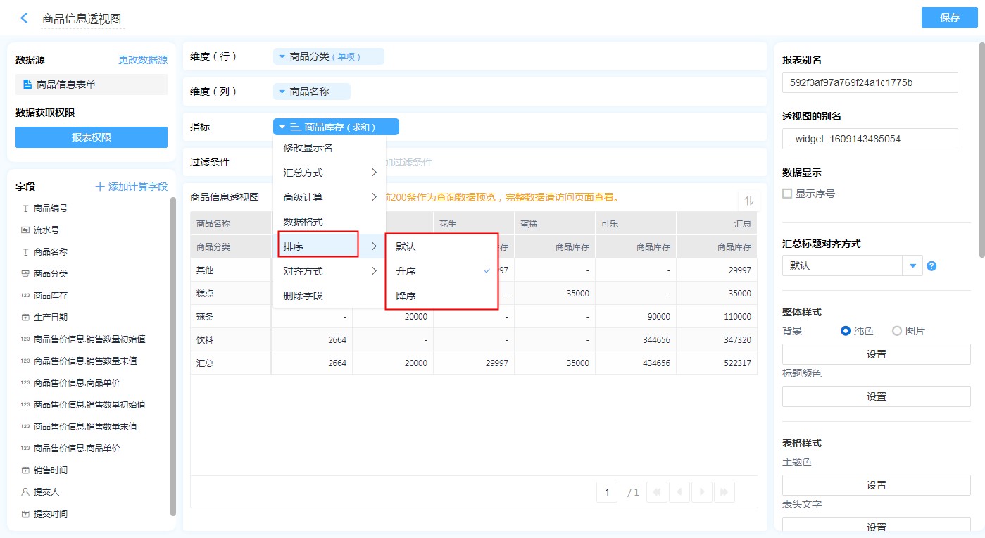 (1)在行维度栏、列维度栏或指标栏,点击字段后设置排序。