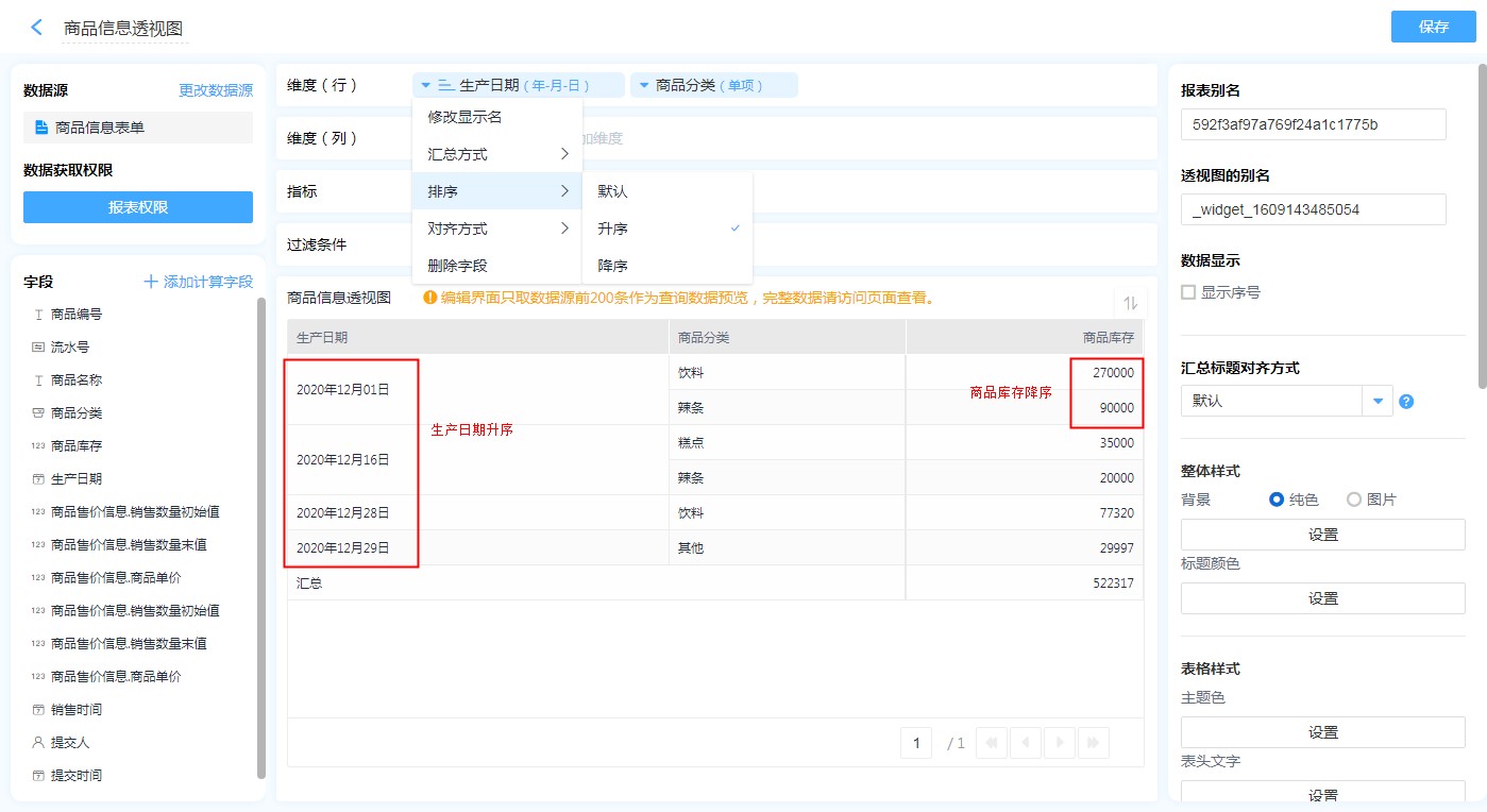 商品管理中,需要按照生产日期进行升序排列,同时,也需要对同一生产日期下的不同分类下的商品库存进行降序排列。