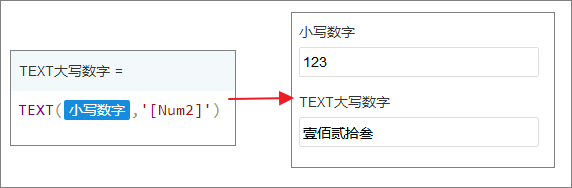 | TEXT(123,"[Num2]") | 结果为 壹佰贰拾叁 |