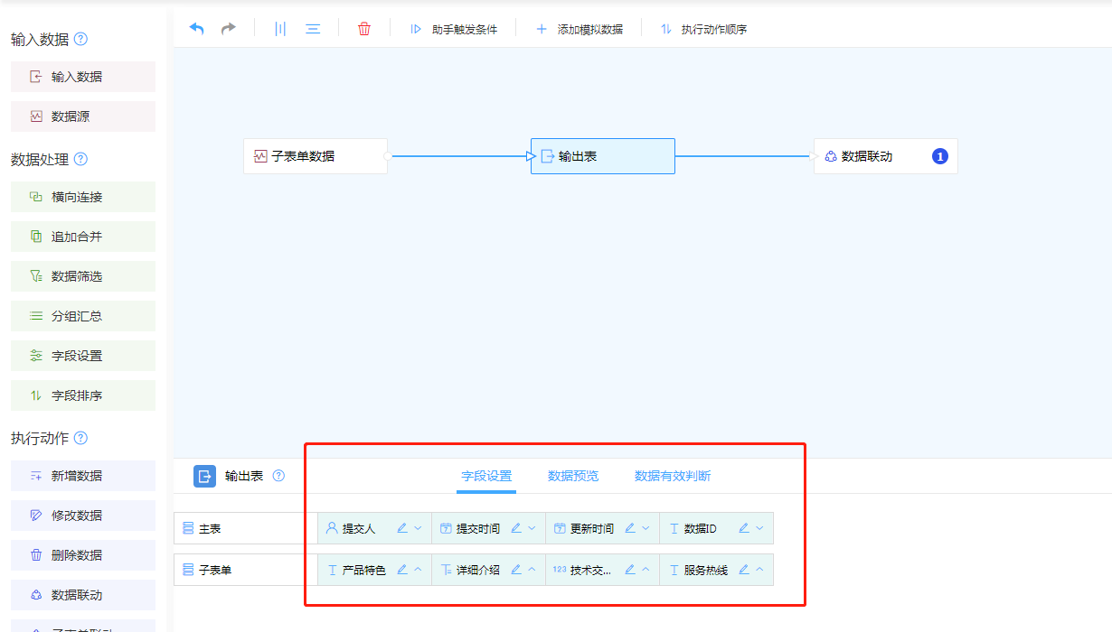 - 在输出表内将来源表单普通字段与子表单字段进行分离