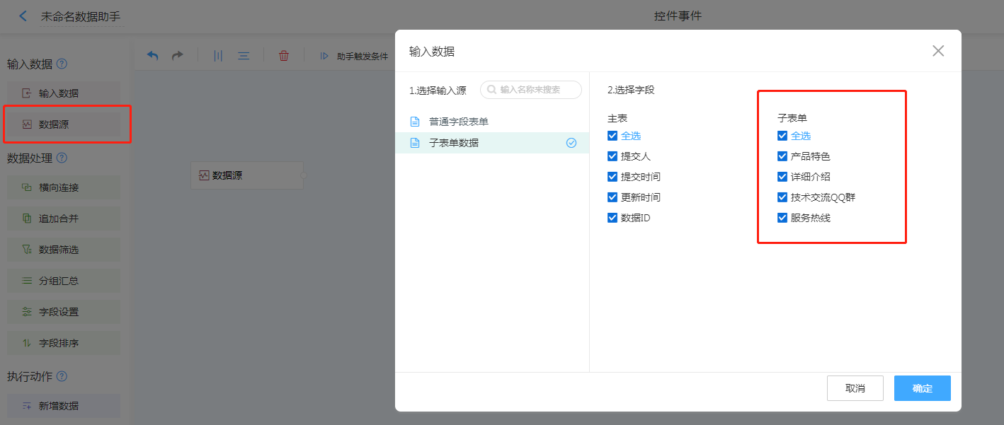 数据源,并选择所需来源子表单中的字段