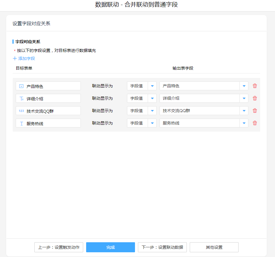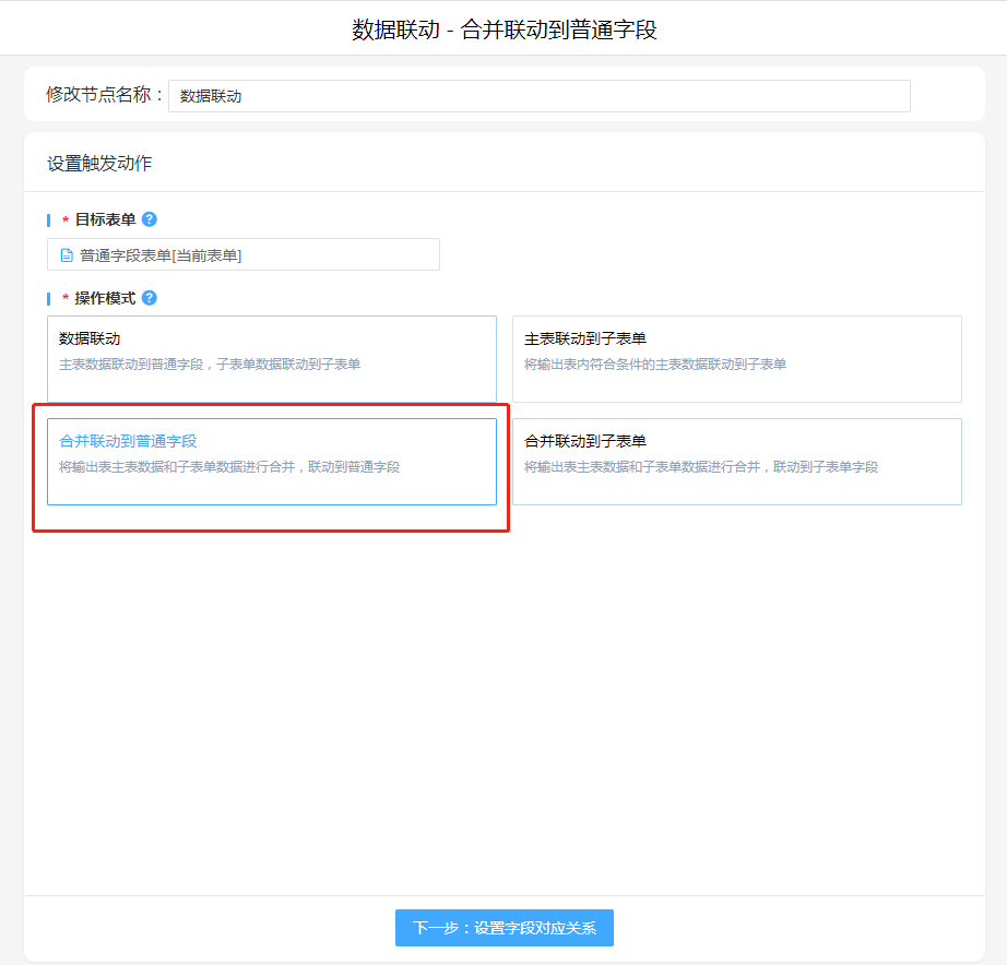 数据联动,操作模式选择"合并联动到普通字段",设置字段对应关系。