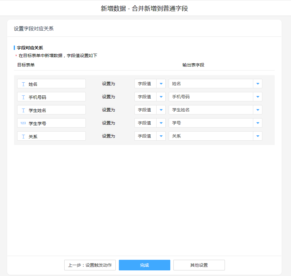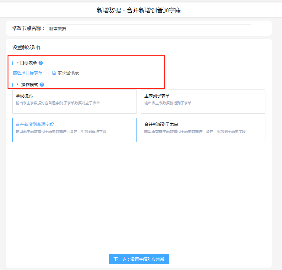子表单联动,选择目标表单,并按照数据格式进行操作模式选择,设置字段对应关系。