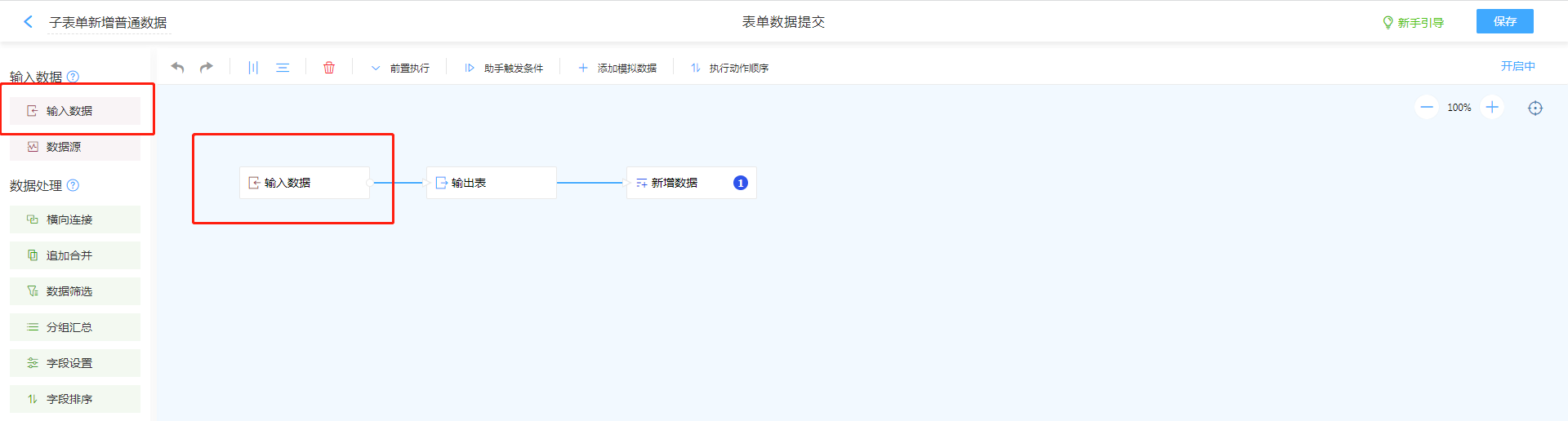 - 进入表单属性页面,找到需要执行数据的表单操作(本案例以新增同步为例),点击进入数据助手配置页面。