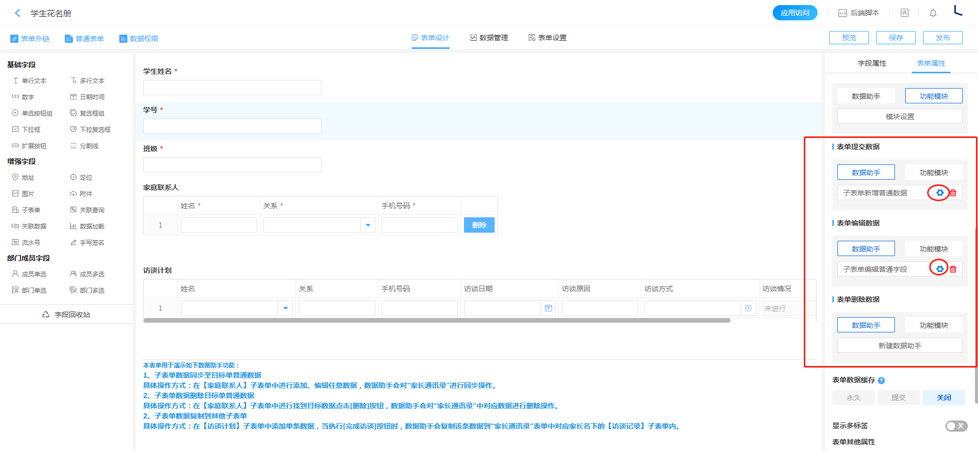 通过对表单进行数据助手配置,实现在增加、编辑、删除子表单数据时,使得相关子表单也能进行同步数据操作。