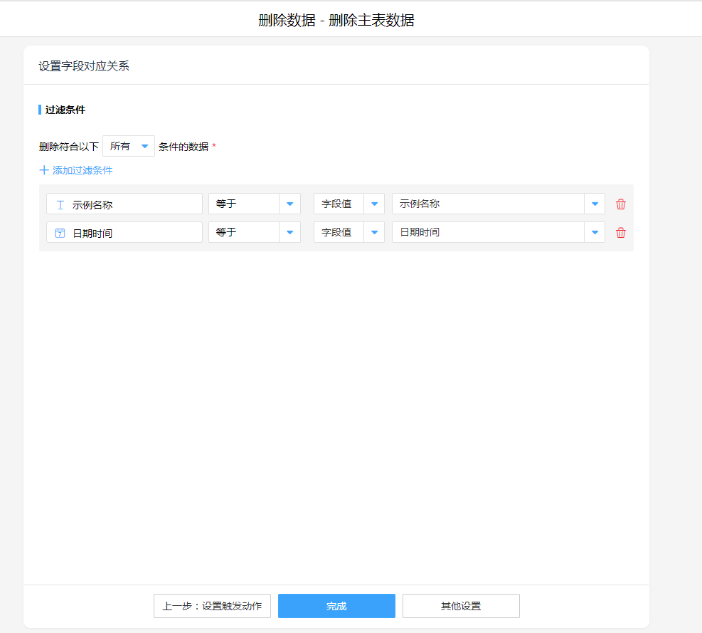 5.执行原数据删除,添加执行动作删除数据,删除条件设定为所有考虑去重字段。