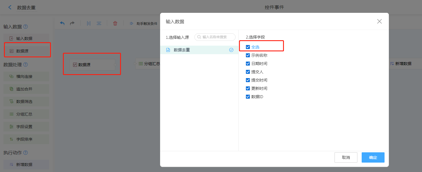 数据源,选择需要去重的表单,全选字段。