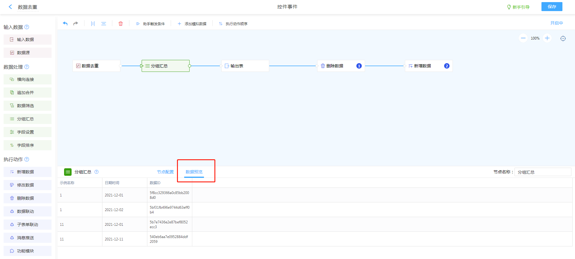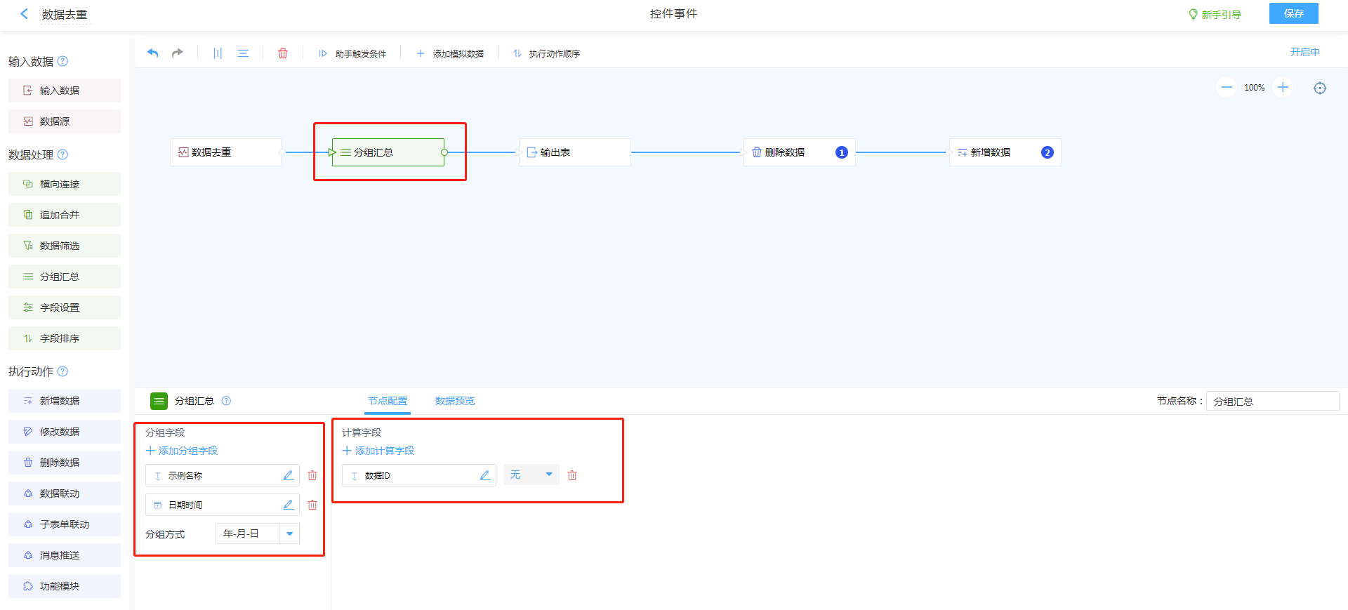 - 例如:本案例需要根据示例名称与日期时间进行去重(既全字段去重),那么需要将两个字段加入分组字段,并在计算字段值加入数据ID。