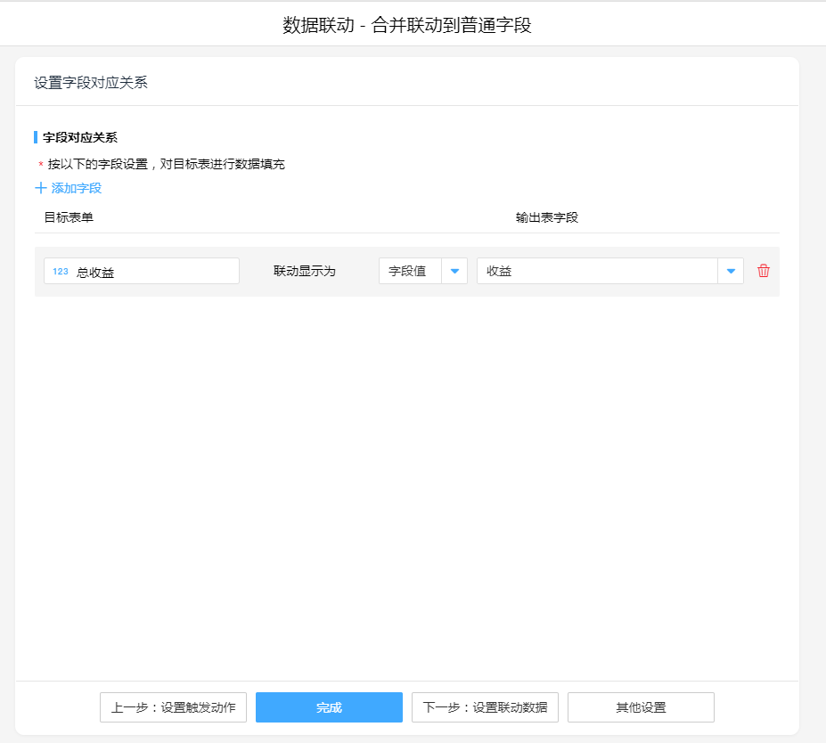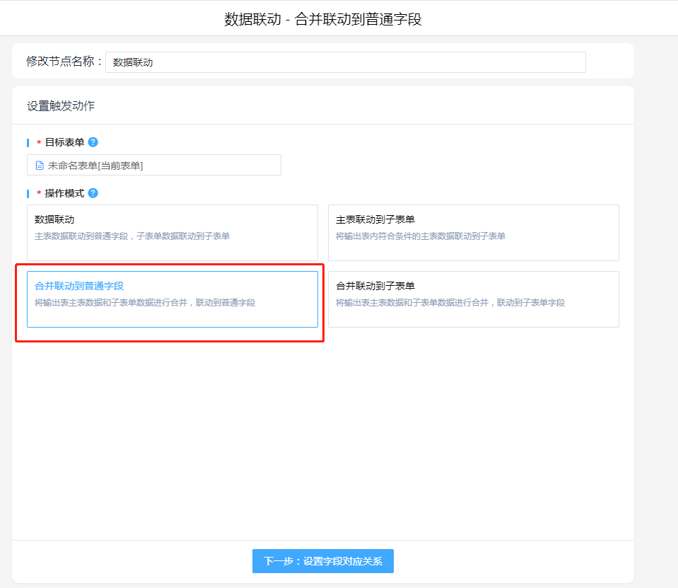 5.添加执行动作数据联动,选择操作模式合并联动到普通字段,并讲字段与计算结果进行对应。