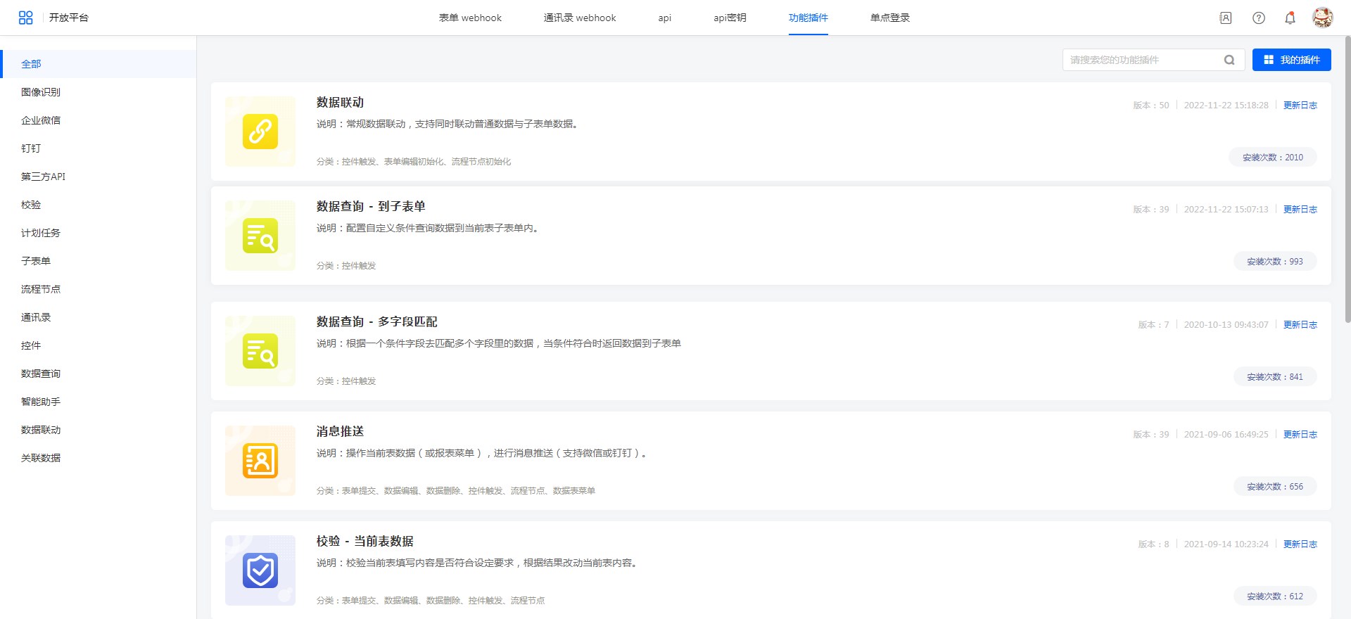 表单功能插件是对整体表单进行功能插件配置,在执行特定表单操作时,启动功能插件,执行后端代码。具体表单操作类型说明详见【功能插件配置说明 - 表单操作类型】