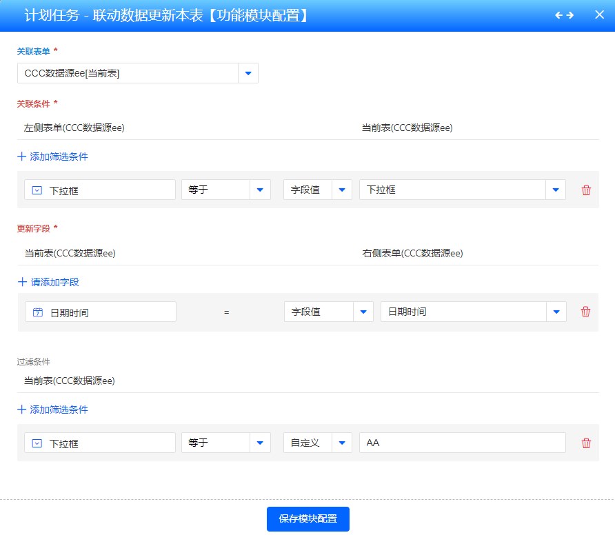 在计划任务配置页面点击功能插件名称进行配置调整。在完成配置调整并保存之后,需要确保计划任务处于启动状态,并返回表单设计页面,在页面右上角对表单执行保存操作即可生效。