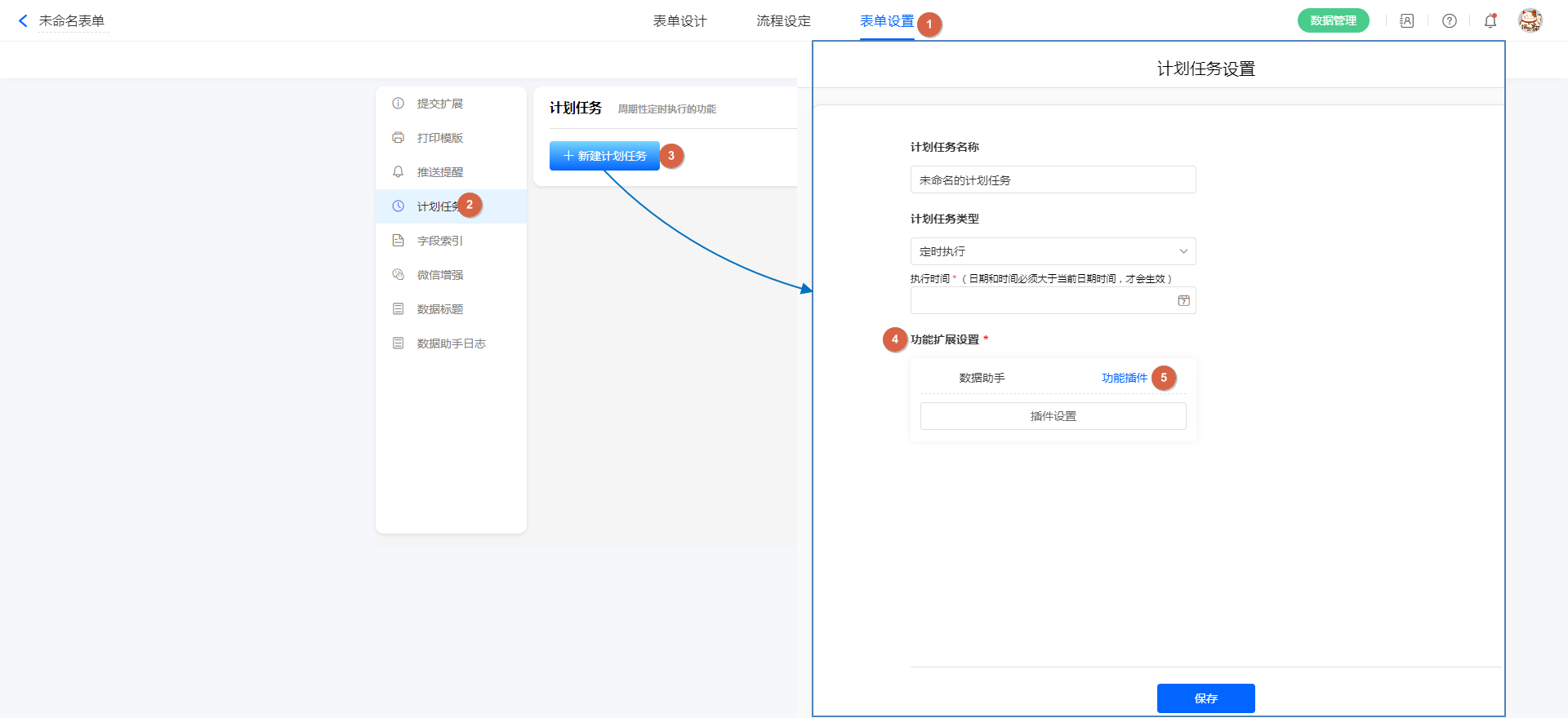 路径:【表单设置】>>>【计划任务】>>>【新增计划任务】>>>【功能扩展设置】>>>【功能插件】
