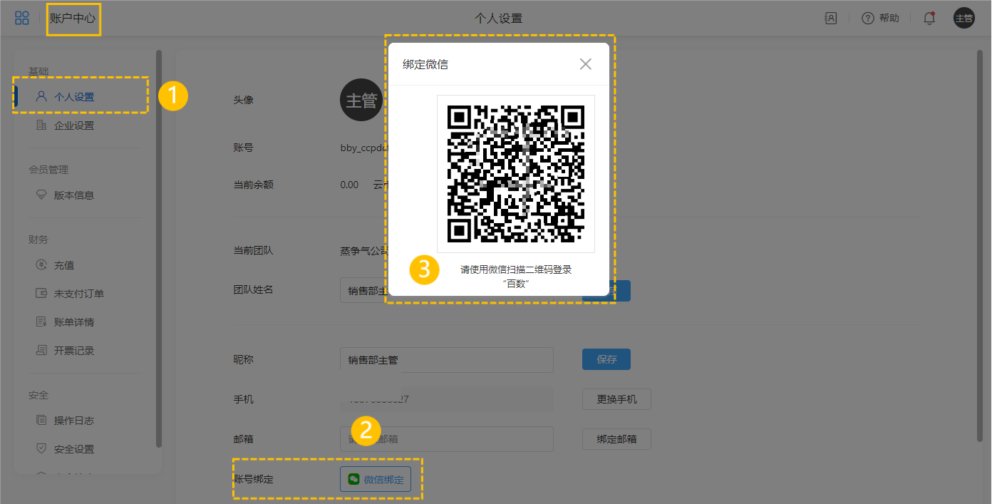 1.在六米云个人中心将六米云账号扫码绑定微信