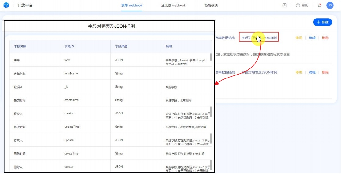 表单数据结构&字段对照表及JSON样例中可以查询表单数据及其字段的具体类型格式信息,用户在开发时可以在此处参照相关信息。