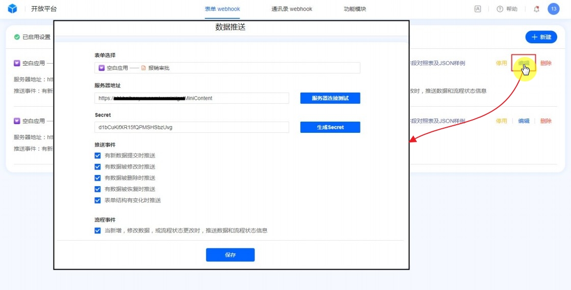 编辑已存在数据推送,【表单】不可修改,【服务器地址】、【Secret】、【推送事件】可编辑。