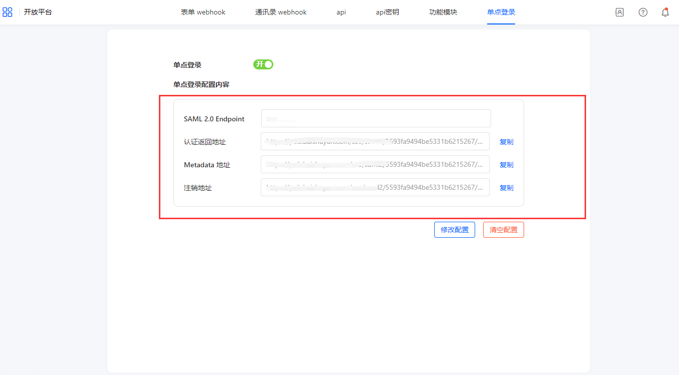 - 应用唯一标识(SP Entity ID):填入平台中的Metadata 地址