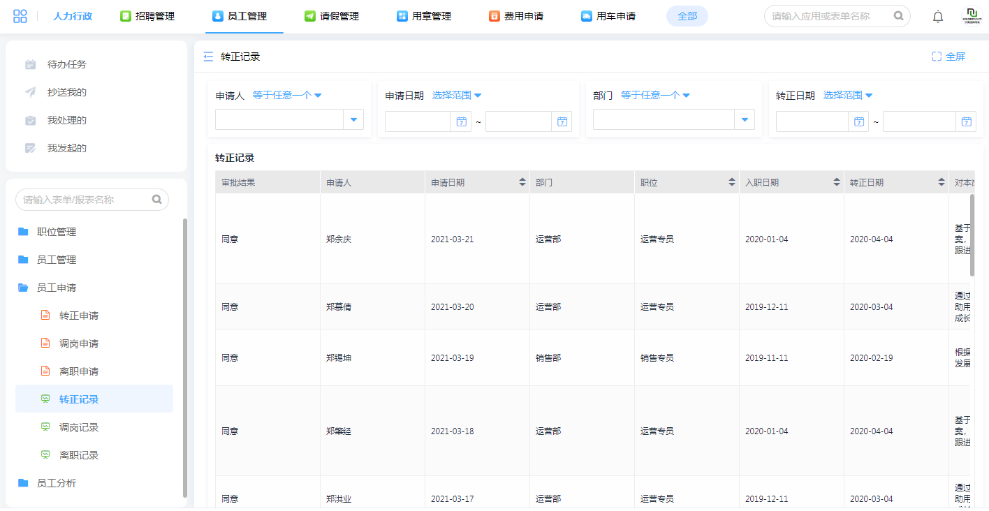 员工转正、调岗、离职等申请操作记录均能通过报表的形式汇总,通过申请人、申请日期、部门等关键字段筛选,可以快速找到记录凭证。
