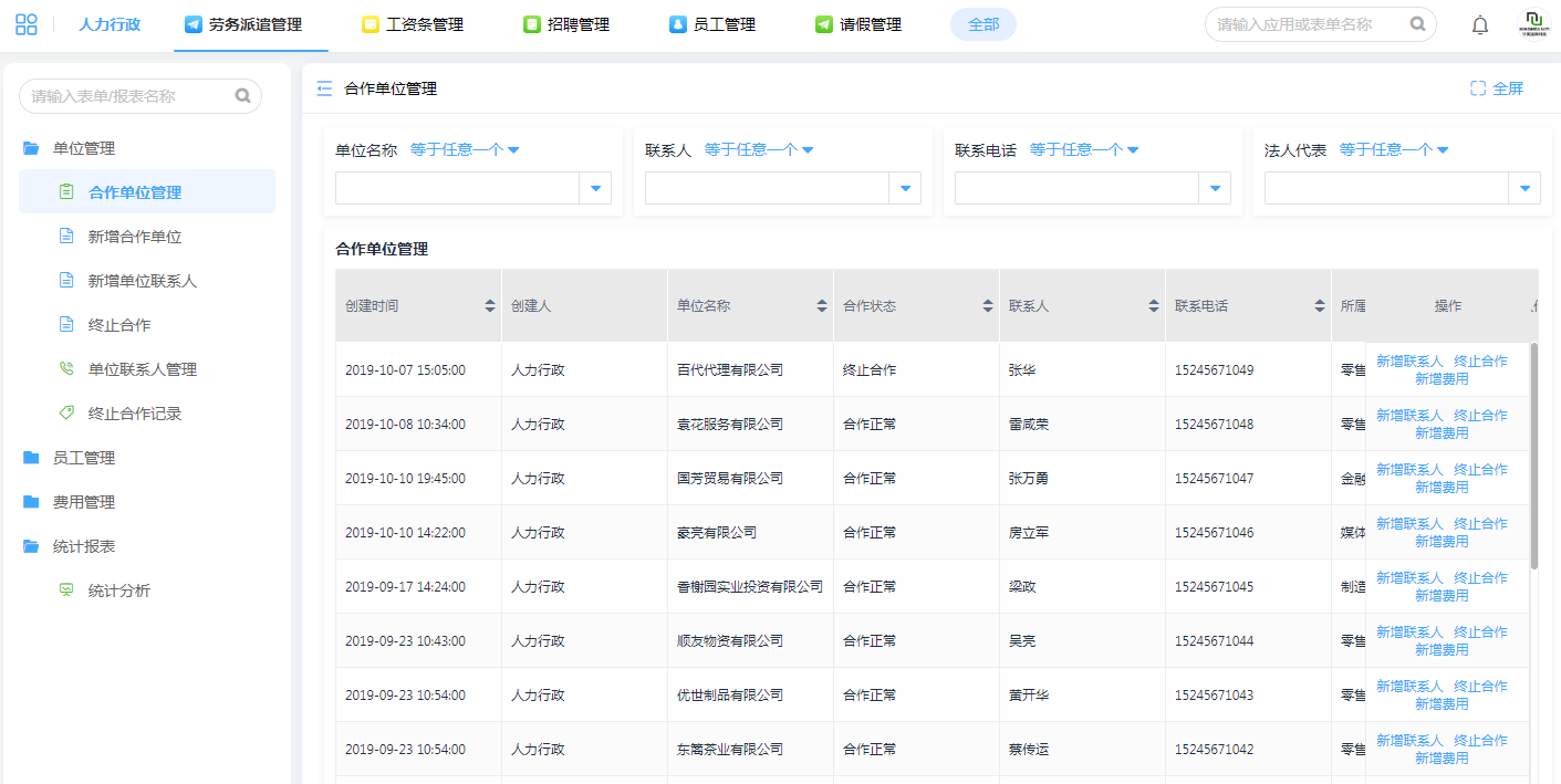 针对人力资源公司的劳务派遣,实现合作单位管理、员工派遣等功能,提高业务处理效率。