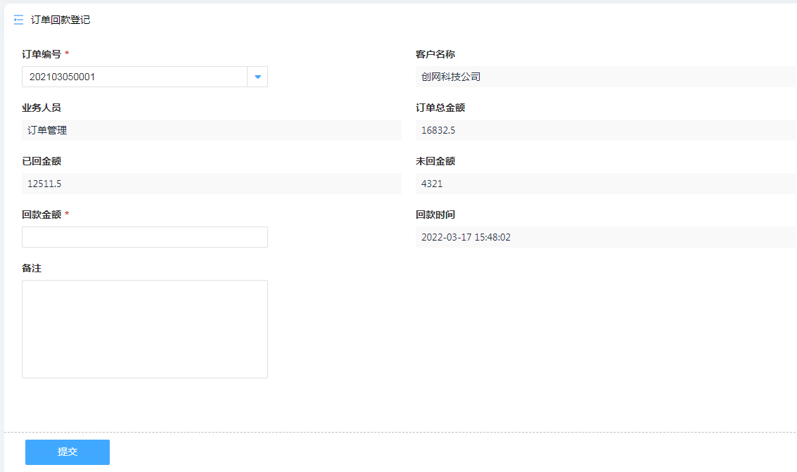 订单回款进展登记有利于企业把控资金流动状况,及时提醒合作客户按时回款。