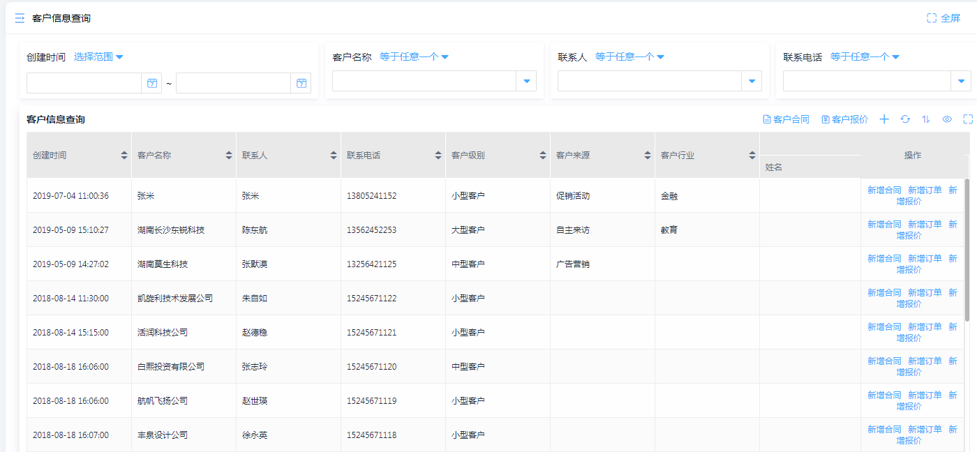 创建客户信息查询报表可以方便办事人员快捷查找合作客户的具体信息,可直接在当前页面选择相应的客户新增合同、订单、报价等操作,无需切换多个表单报表,高效且准确。