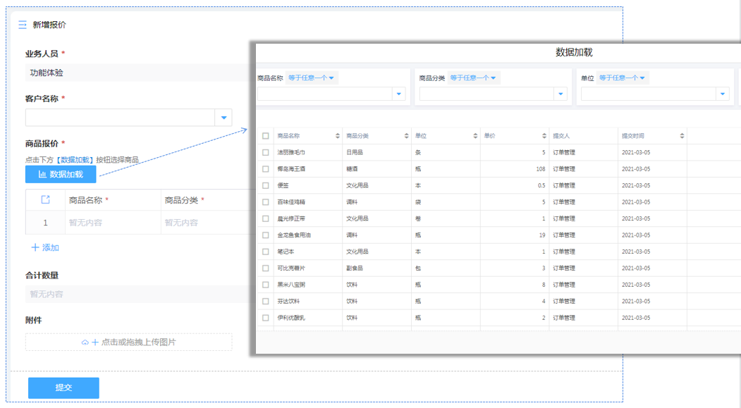 借助数据加载功能,在新增报价表单可以直接勾选商品详情,减少手动录入带来的商品细节错误,提高操作准确率。