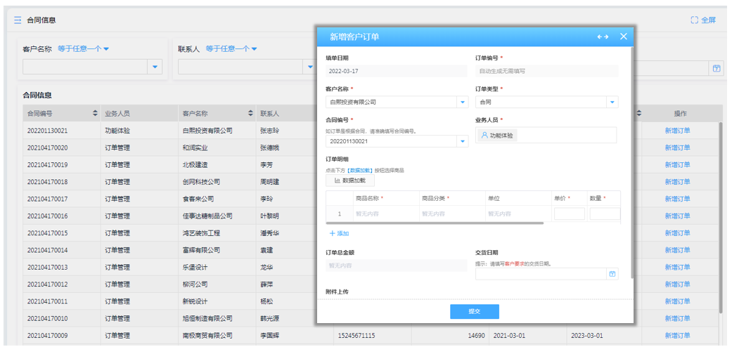创建合同信息报表便于客户合同的统一管理,根据关键词筛选可方便快捷调取需要的合同信息,新增订单也可以借助控件设置直接跳转页面进行编辑。