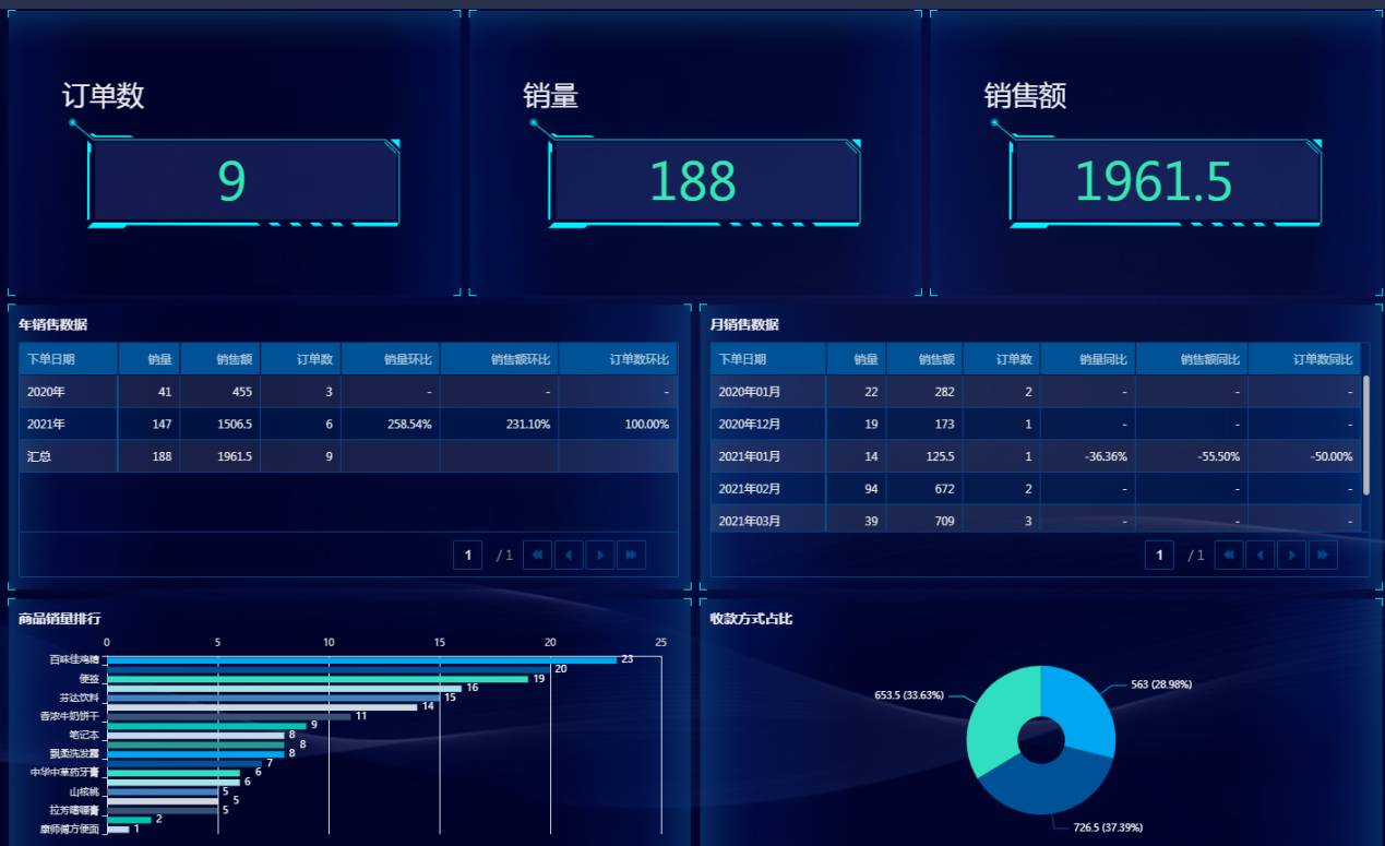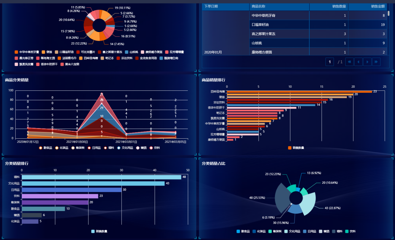 呈现商品销量占比、销量汇总、销量排行等各类指标数据,为商品生产数量、仓储比例等提供数据支撑。