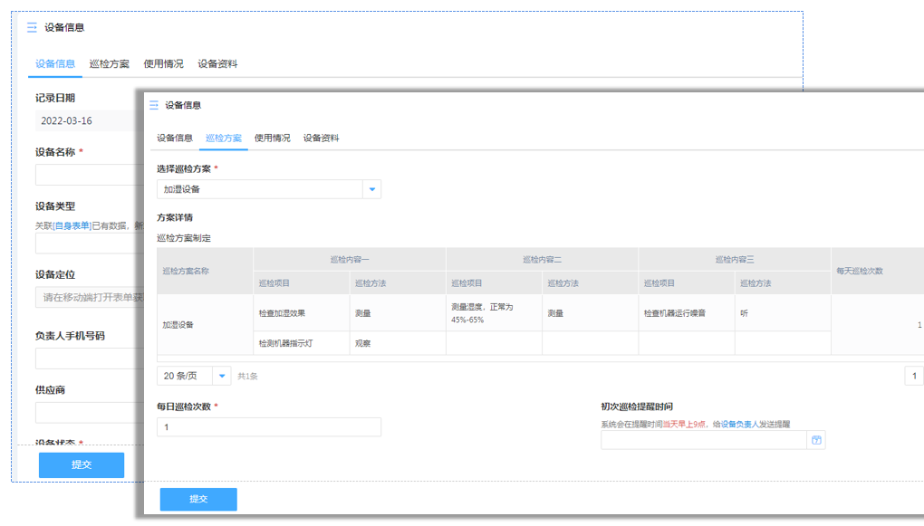 借助六米云子表单功能可以同时录入或调阅与设备信息相关的多个表单内容,例如切换巡检方案表单可以确认巡检指标,减少检查纰漏。