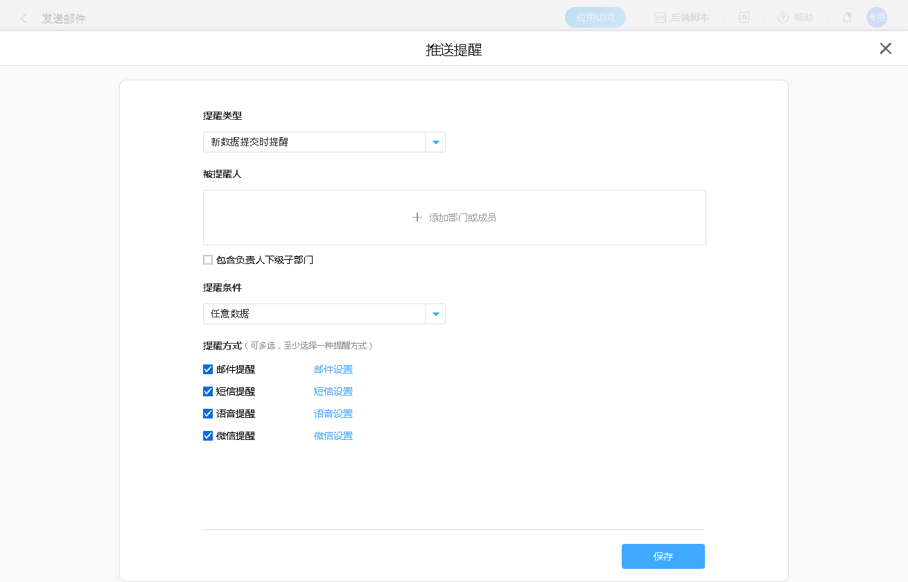 短信提醒可以设置指定接收人,接收消息的成员需绑定手机,否则无法收到提醒;