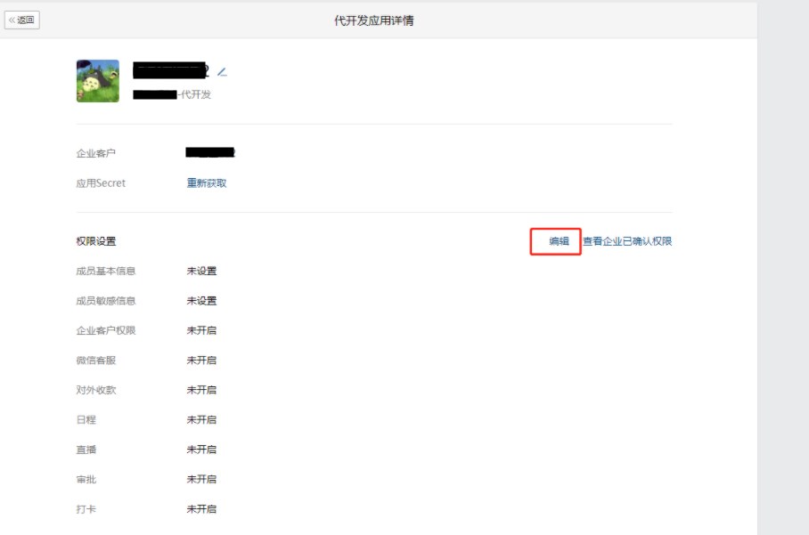 1) 进入企业诶新服务商后台,代开发应用详情页,权限设置模块,点击右上角“编辑”按钮,可进行代开发应用自定义权限编辑。