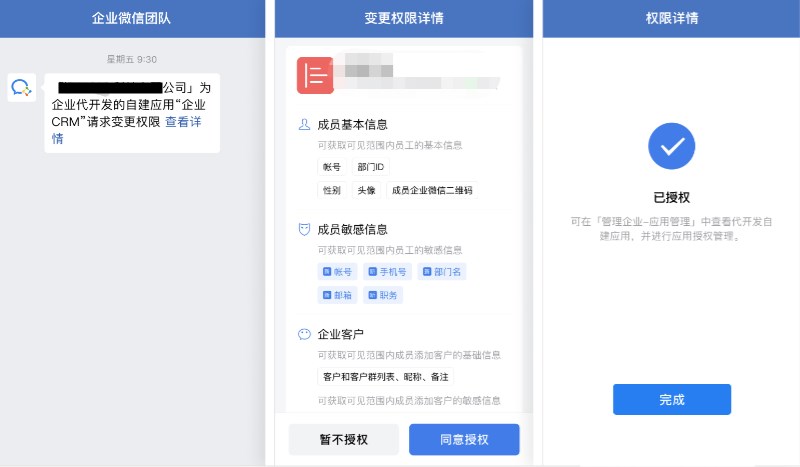 3) 企业客户管理员收到代开发应用权限变更消息,若企业同意权限则服务商所选择的自定义权限立即生效。