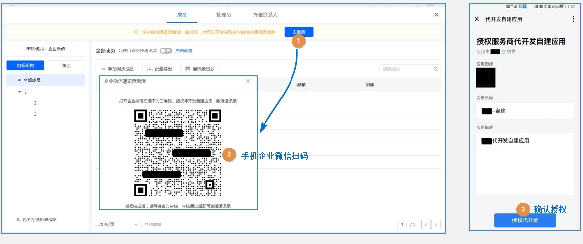 在[系统]->[通讯录]中,点击提示的[去激活],使用企业微信扫码弹出的二维码,确认授权代开发应用。