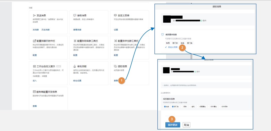 • 方法二:在[企业微信后台]->[应用管理]->[代开发应用]->[授权信息]->[成员基本信息]->[自定义权限]->[成员基本信息],勾选[姓名]和[部门名],保存更改。